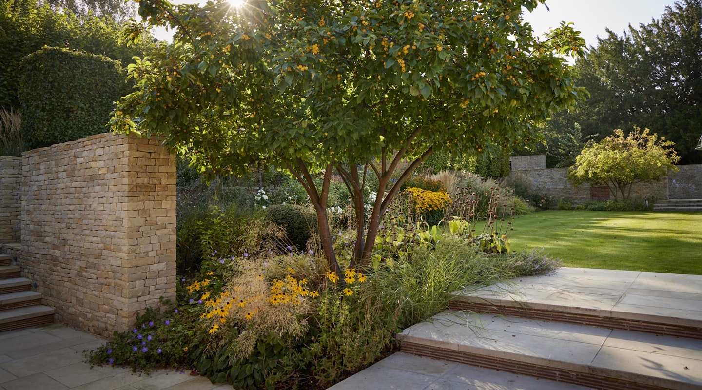 Materials reference the local geology with fossil-rich limestone terraces and free-standing dry-stone walls. The brick for the retaining walls was sourced from a local manufacturer to match the house, and creasing tiles used for the step risers reference a typical Arts and Crafts detail.