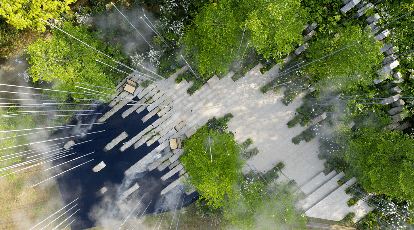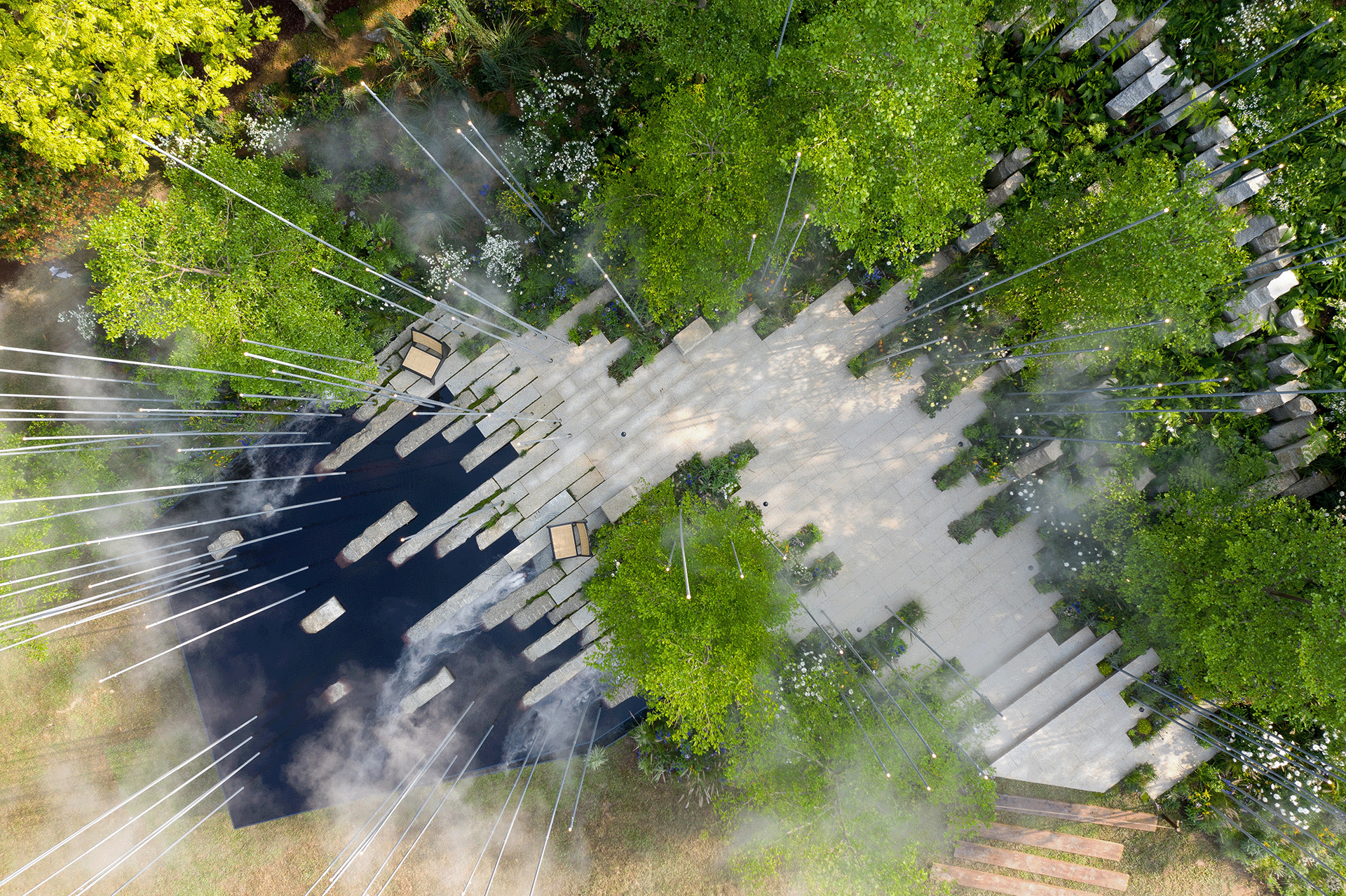 The connections between man and nature are accented by a random pattern of tall masts, which sway gently in the breeze and add height and drama to the space. Each mast carries either a small LED or a misting spray further animating this element and allowing the garden to be enjoyed after dark.