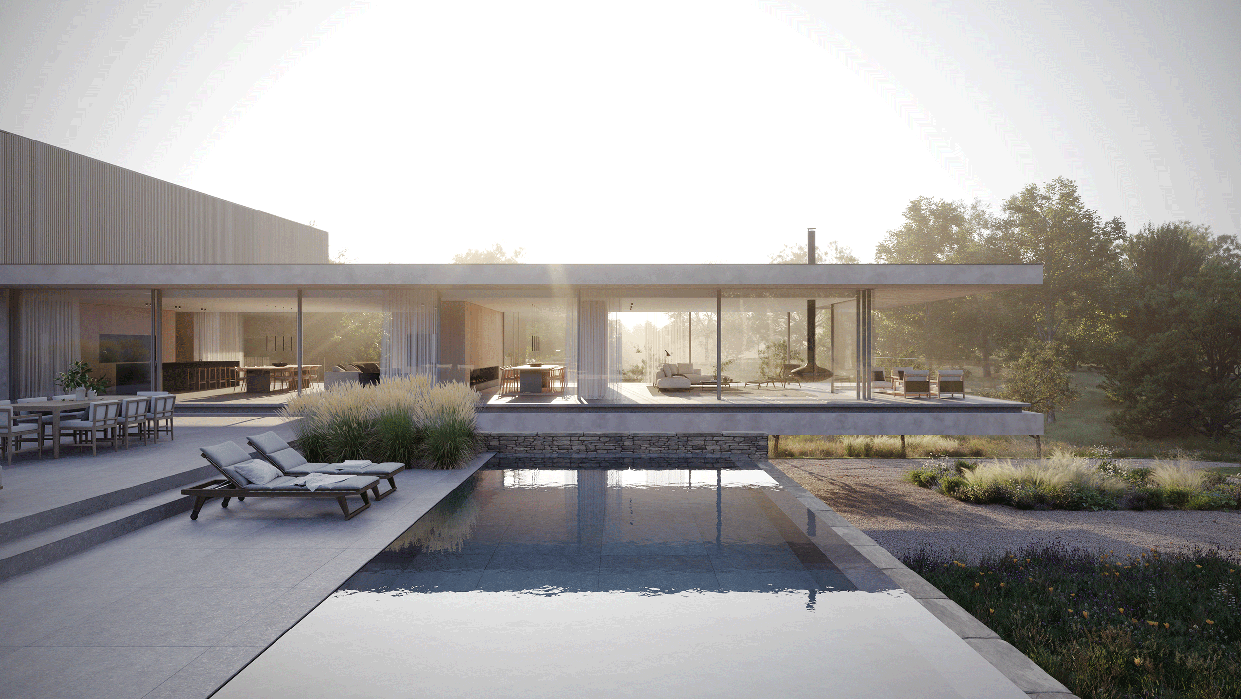 To the south, the dramatic infinity edge of an outdoor swimming pool reflects woodland, meadow and sky. The paved route continues here, ending in a secluded seating area with a fire pit and views back to the house.