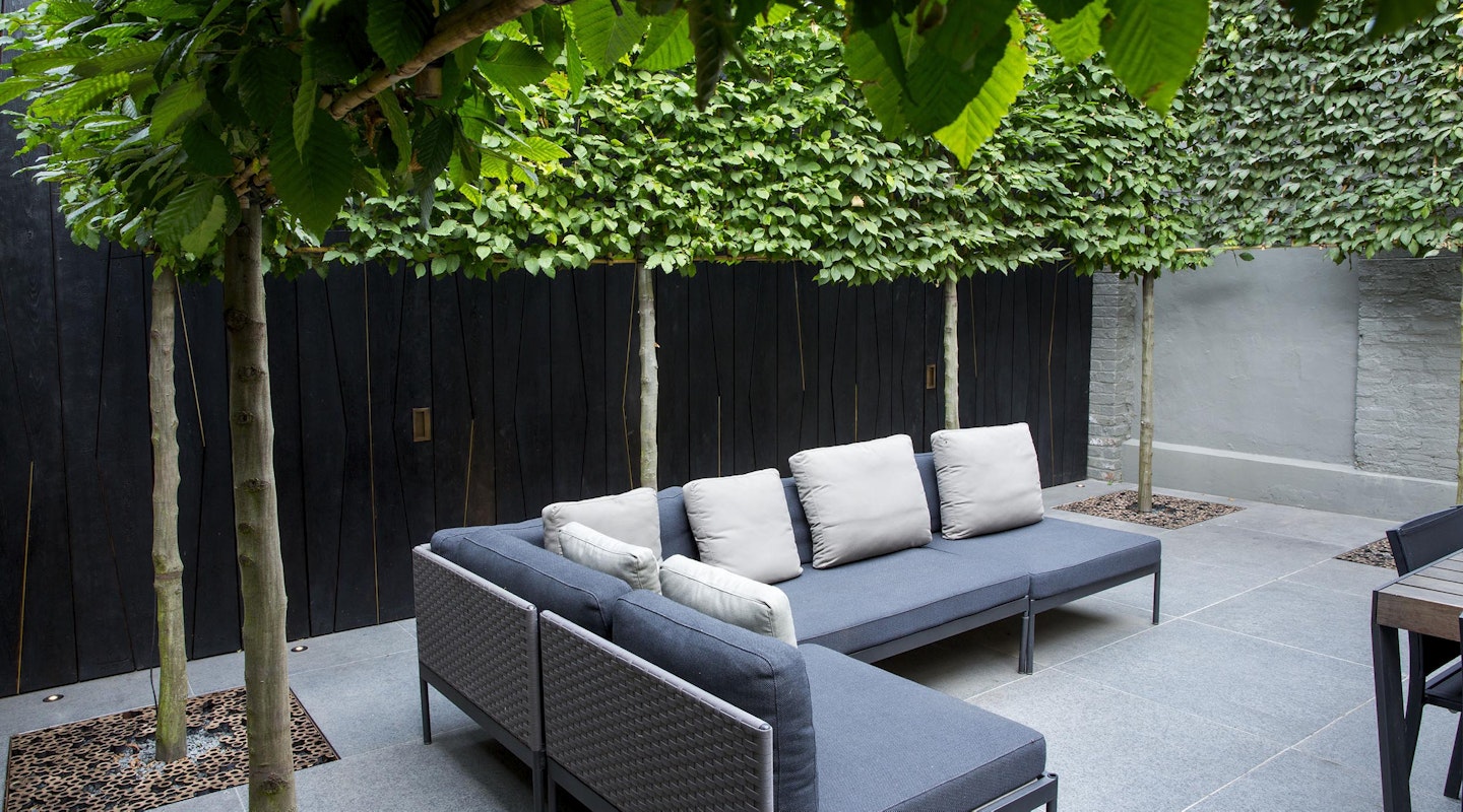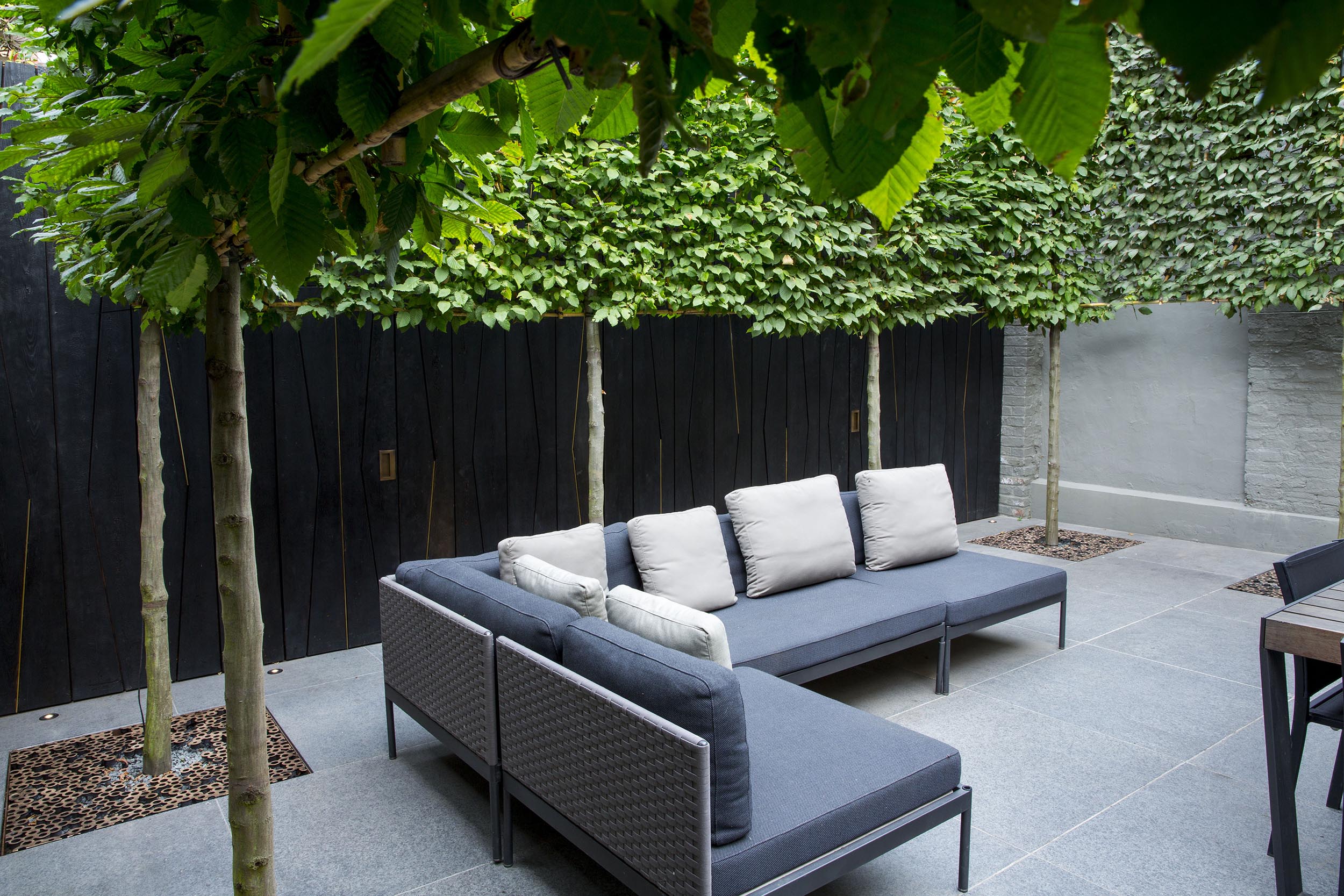 The rear garden at this quietly elegant central London house provides a space for events and entertaining, and continues the language and tonal range of its interiors by James Plumb.