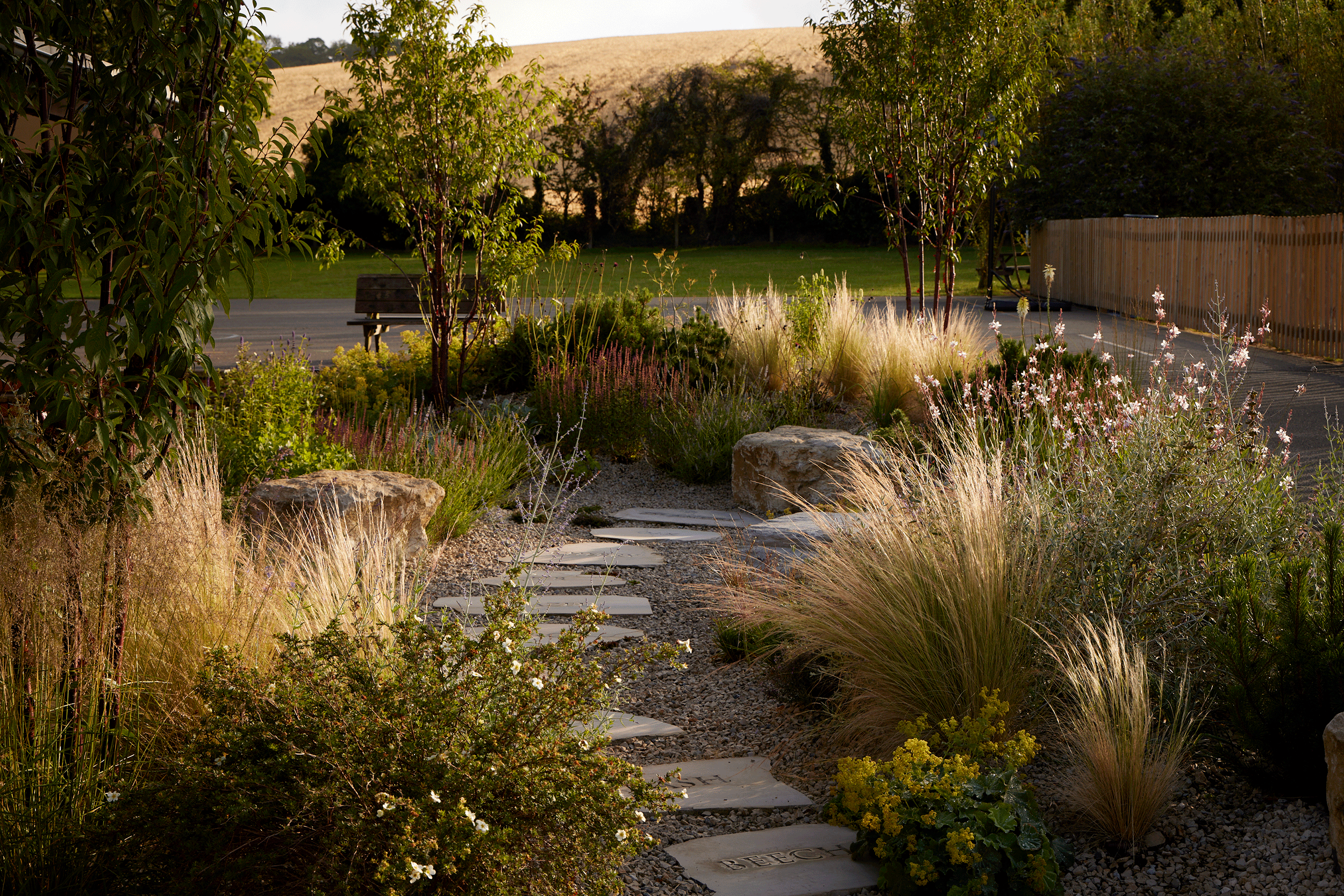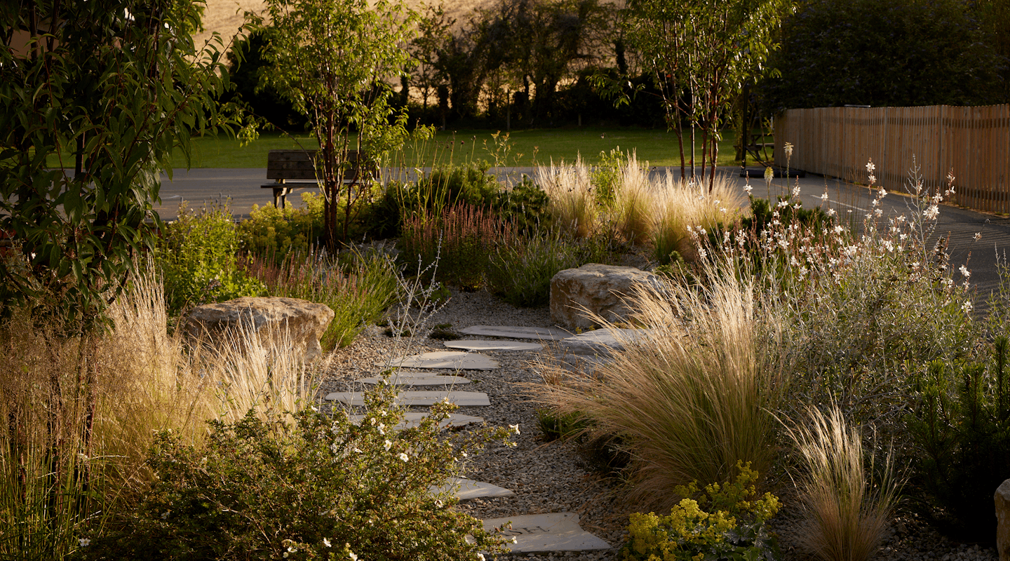 The garden sits within a wider playground setting, with land scooped out to create a sheltered space at a lower level. Perennials, grasses and shrubs have been chosen for colour, texture and variety. Boulder seats were positioned to offer the potential of time alone or interaction with others.