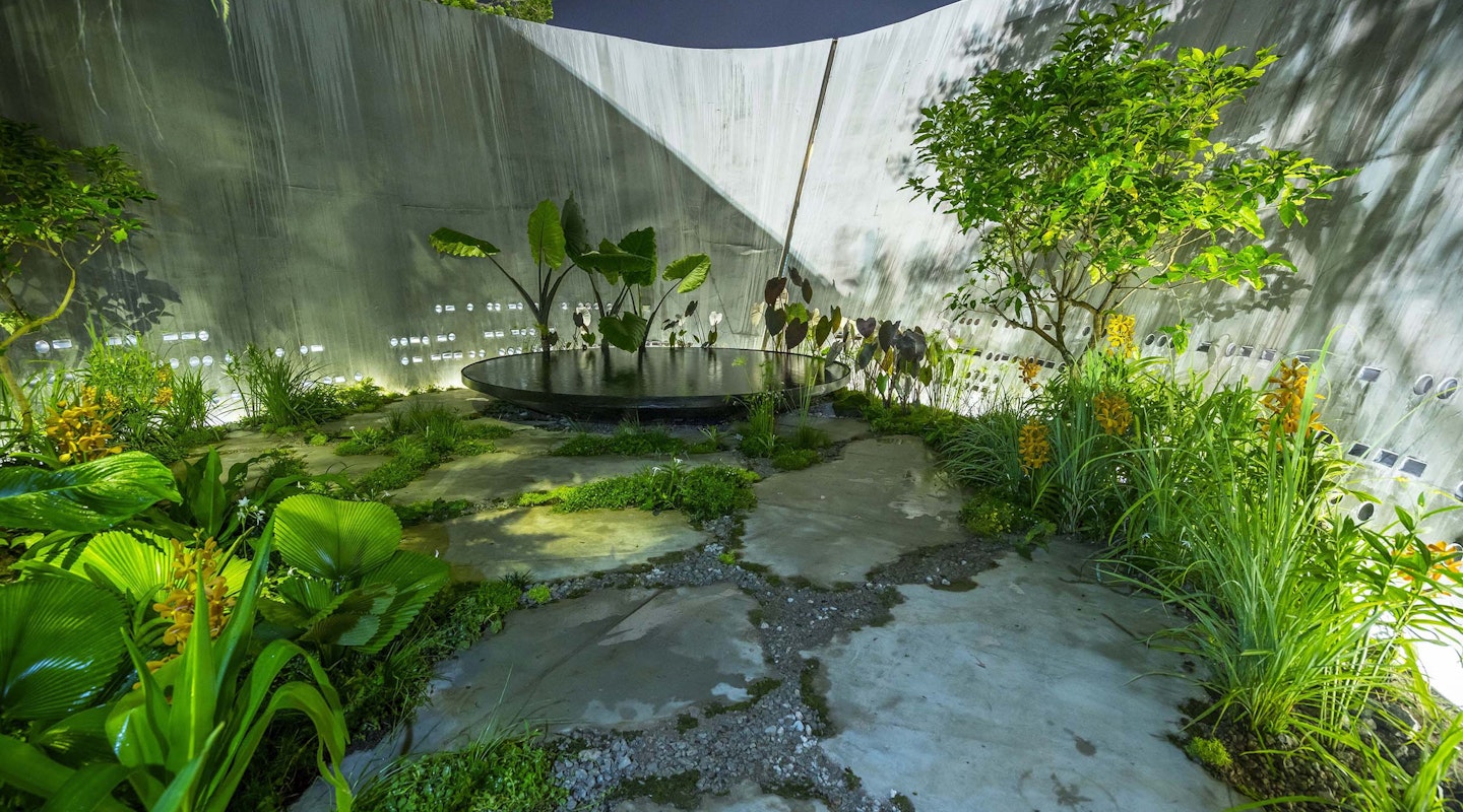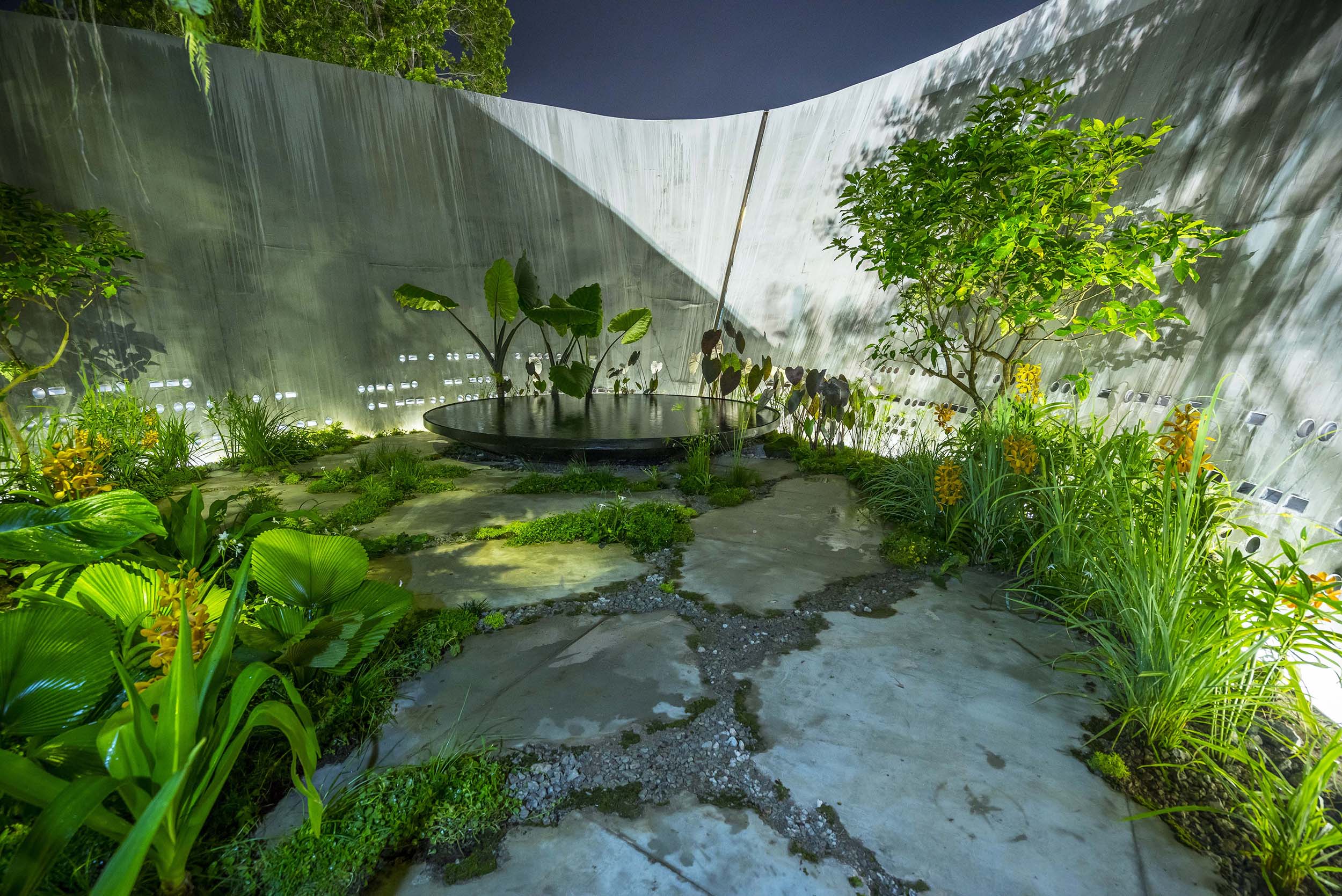A group of rain trees spread over the garden, their elegant branches creating shadow patterns and dappled light. Concrete paving is planted with ground-hugging plants and mosses to soften the tread and green the space. Boulder seating faces a low crucible of water that shimmers and reflects the changing light of the day. Hidden lighting creates a continuous glow on the faces of the curved walls.